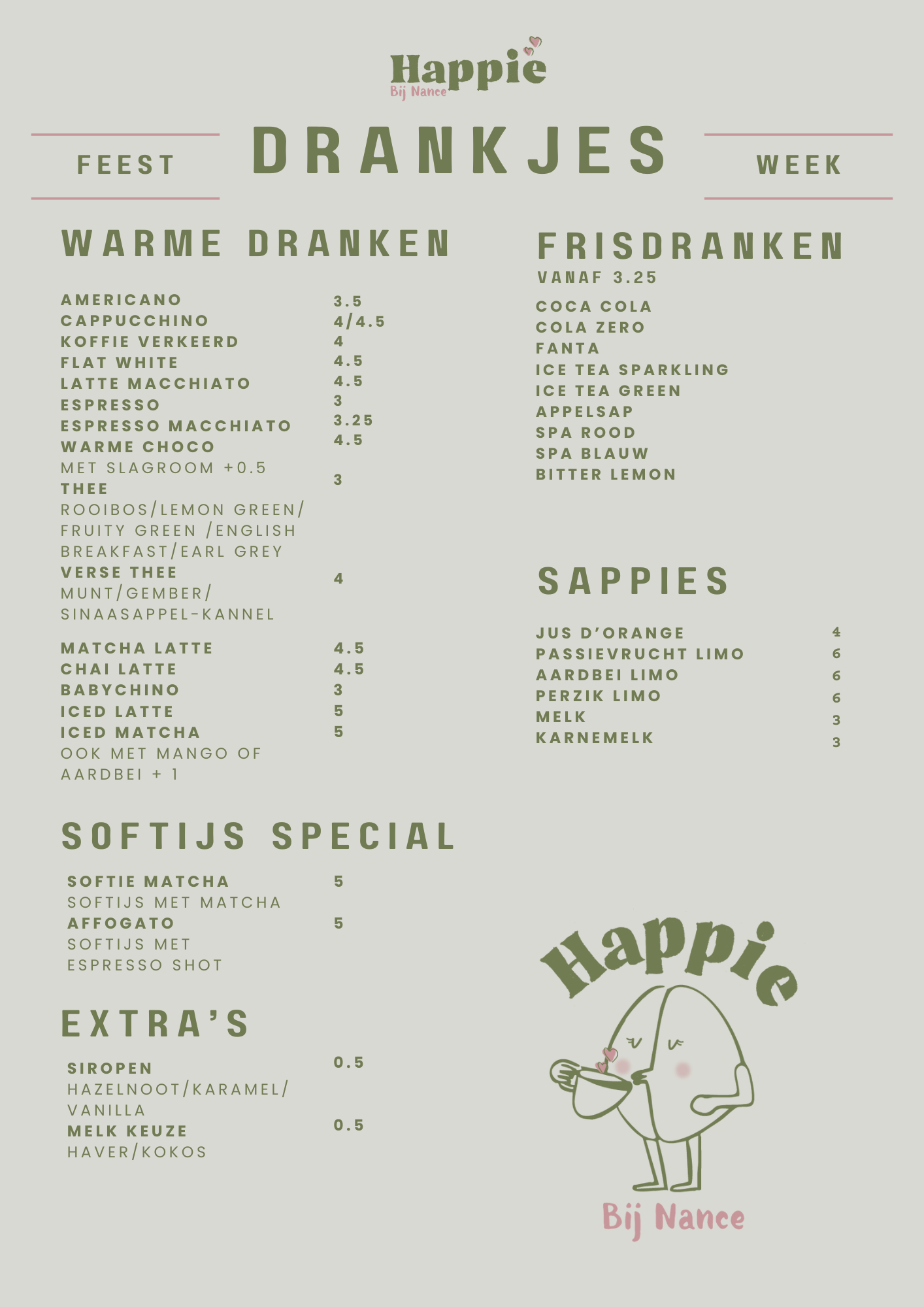 Of je nou binnenwandelt voor een flatwhite, een lekker broodje uit de oven of gewoon even wil ontsnappen aan de drukte bij ons vind je je momentje. Alles op de kaart is met liefde gemaakt, een beetje eigenwijs en vooral: precies waar je zin in had. Sla ‘m open, jouw Happie wacht al op je. Vragen over allergenen, zin in iets anders, of een speciaal verzoek? Laat het ons weten, we denken graag met je mee.